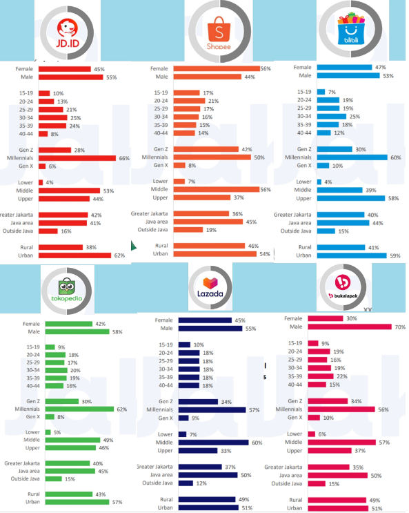东南亚各大电平台用户大盘点: Shopee女性群体占比最高 据斑马日本海外仓了解,印尼的大多数消费者都会选择在多个平台上进行交易。然而,只有 Shopee 平台以女性顾客为主。 “总的来说,2022 年下半年的平均用户交易量为每月 475810 印尼盾(约合 31.5 美元),花费超过这个金额的细分用户群是男性、X 世代和千禧一代,”报告称。 以下是 Lazada、Shopee、Tokopedia、Bukalapak、JD.ID 和 Blibli 在印尼的消费者人口统计对比: 如上图所示,只有 Shopee 以女性顾客为主(56%);而其他平台男性顾客居多,即:JD.ID(55%)、Blibli(53%)、Tokopedia(58%)、Lazada(55%)、Bukalapak(70%)。 另外,千禧一代在六个电商平台的客户数量中占主导地位。 手机系统太旧或无法登录Shopee App 据 Shopee 消息,为了提供安全的购物体验,Shopee App 及相关网站将不再支持过旧的操作系统,请确保您已将手机操作系统升级至下列最新版本: 安卓 5.0 及以上 iOS 5.0 及以上 Shopee App 2.73 及以上