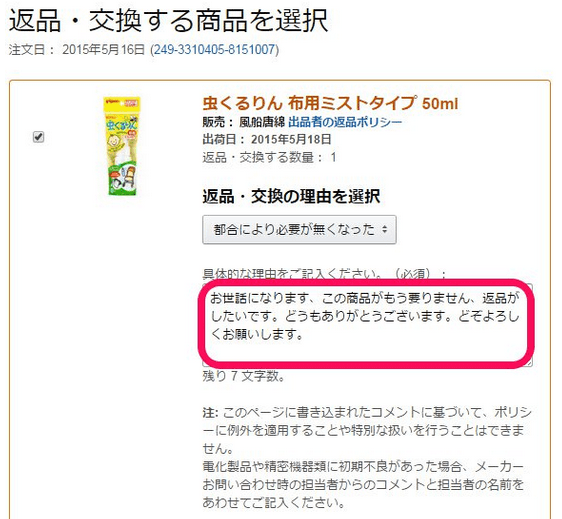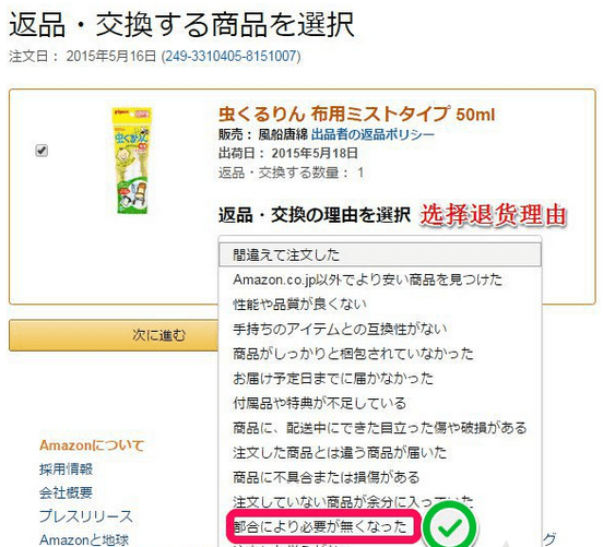 5、选择好退货的理由之后,在文本框里面输入更加详细的退货理由。如果不熟悉日语的可以直接复制一下的文字:【お世話になります、この商品がもう要りません、返品がしたいです。】(这句话中文翻译是:你好,这件商品已经不需要了,我希望可以退货)。然后点击【次に進む】就可以进入到下一步了。