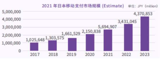 据矢野研究所数据报告显示,日本移动支付市场规模将从2017年的800万美元增加到2023年的4800万美元。