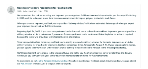 似乎是看到了卖家们担心,前不久亚马逊美国站发布公告称:“从2023年4月24日到5月2日,亚马逊将推出新的“发送至亚马逊”要求,以帮助亚马逊更快地为卖家的产品入库。”