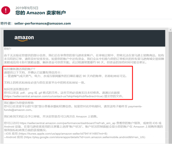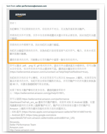 如下图所示,亚马逊可能会要求卖家提供额外的证明材料来佐证注册时提供的信息。此类通知通常seller-performance@amazon.com邮箱发出,但不同的站点间可能有所差异(例如,日本站点的通知可能是通过alliance@amozon.co.ip发出)。请严格遵照业绩通知中所列出
