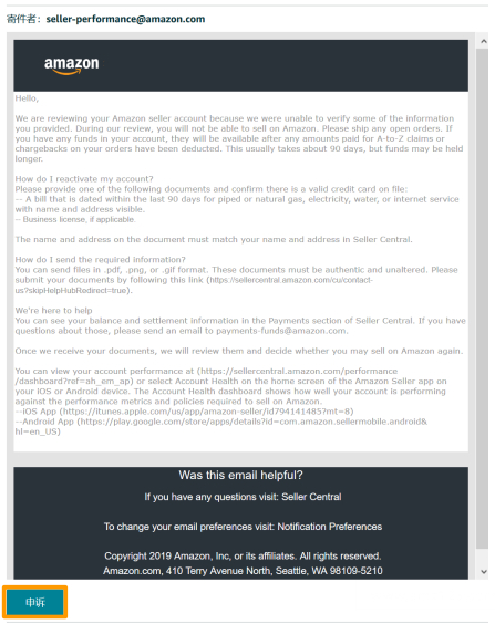 1.若您已按照要求,收集好资料并准备提交文档给亚马逊时,您可以点击业绩通知底部的“申诉”按钮,开始您的申诉。