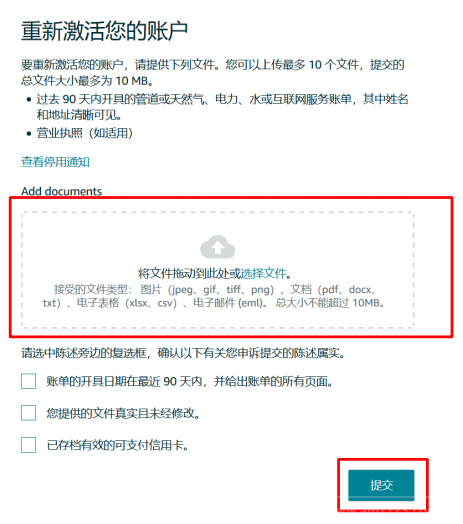 请避免:在亚马逊有足够的时间审核您的申诉之前,重复提交文档提交的文件不完整、难以辨认、经过篡改、标记或截图提交过期或无效类型的文件