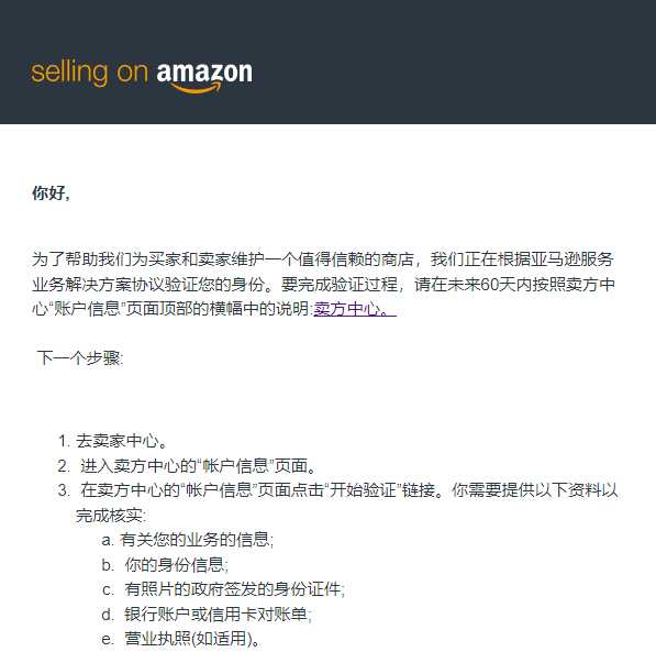 前几天一个店铺收到了亚马逊邮件,提示要提交资料验证卖家的身份。