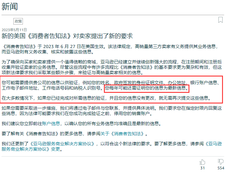 而且年审并不是亚马逊主动发起的,而是新的美国《消费者告知法》对卖家提出了新的要求。
