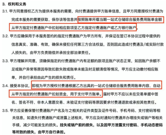 而关于这份协议,还有一份《付费通代收业务服务协议》,其中也表明了仓储费的存在。
