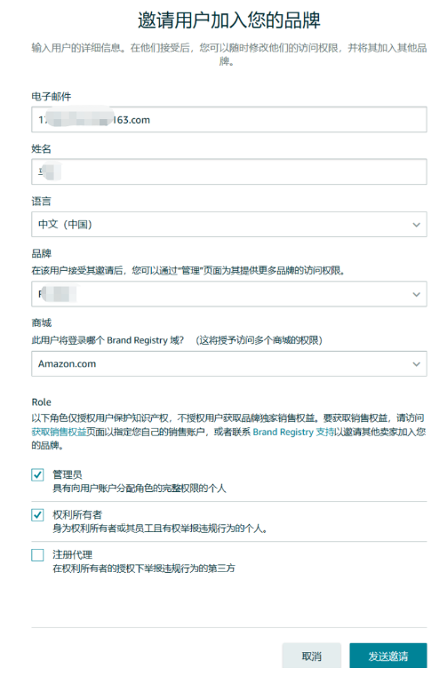 4.填写“品牌授权”信息,最后点击发送邀请!
