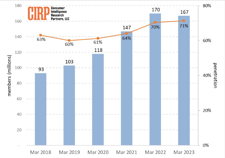 截至今年3月,美国拥有的Prime会员数量下降至1.67亿人,较去年同期的1.7亿人减少。虽然Prime会员的交易量占比仍为71%,与去年同期的70%基本持平,但会员增长率趋于平稳。