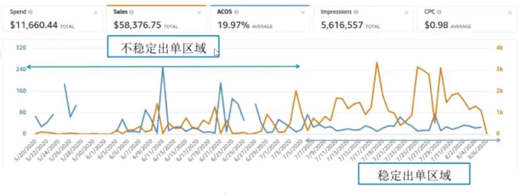 从上图可以看出,这款产品从5月初到7月初都处于不稳定的出单时期,ACOS曲线的波动也很大,但是在7月5日之后,出单渐趋稳定,这个时期适合去做利润的优化。