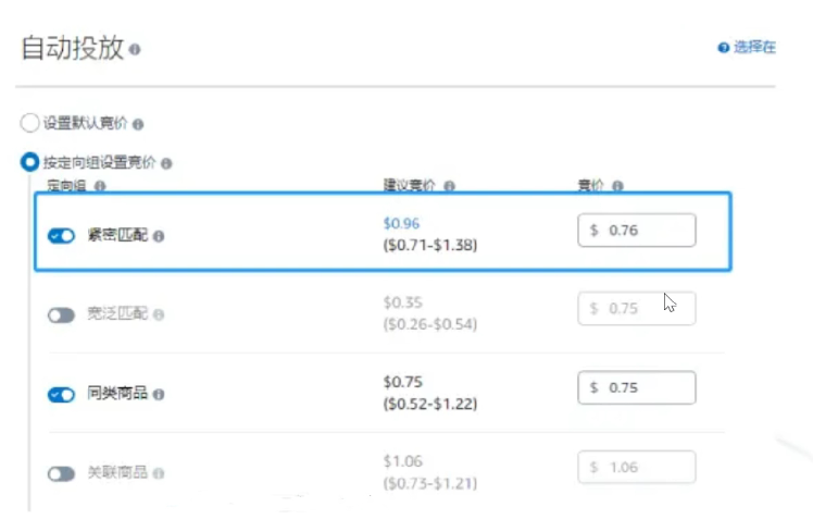 在该方案中,需要三组自动广告,分别设置高、中、低三组不同的建议竞价出价。建议采用Close-Match,这样可以获取最精准的流量,精准词的选择可以是类目的高相关词,然后取其中的3-5个,使用建议竞价*1.5作为出价。