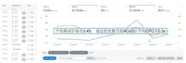 其实那时,建议竞价对于产品本身的客单价是比较高昂的,于是这位卖家在这款产品从新品期到老品期的一年时间里,最初把建议竞价卡在0.45开始测试,慢慢递增竞价,找到新词,经过数月的优化,综合ACOS到33%。