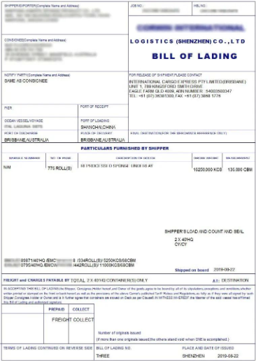然后,承运人将这些货物交付给收货人( 即最初购买货物的人)。 提单(B/L) 本质上是指托运人、收货人和承运人之间的运输合同,其中规定了运输条款和条件。
