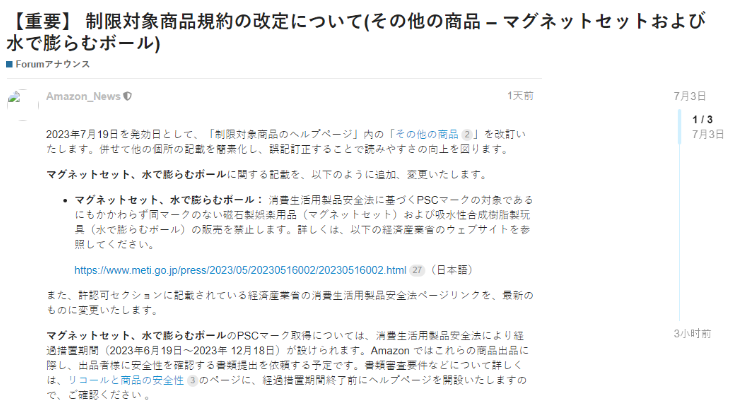 近日亚马逊日本站发布一则关于受限制商品条款的修订(其他商品-磁铁套装和水膨胀球)的重要公告,公告如下