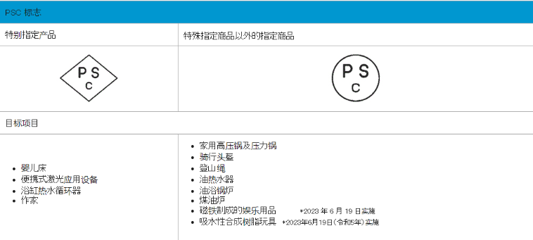 根据消费生活用品安全法,将从产品的结构、材料、使用情况等方面认定对一般消费者的生命或身体特别有危害可能性的产品指定为"特定制品",并通过政令进行规定(法第2条第2款)。从事特定制品的制造、进口或销售业务的人士必须为每种产品标注符合法令规定的技术标准(法第3条)的标志(PS(Product Safety=产品安全)C(Consumer=消费者)标志),否则不得销售或用于销售目的的陈列(法第4条第1款)。