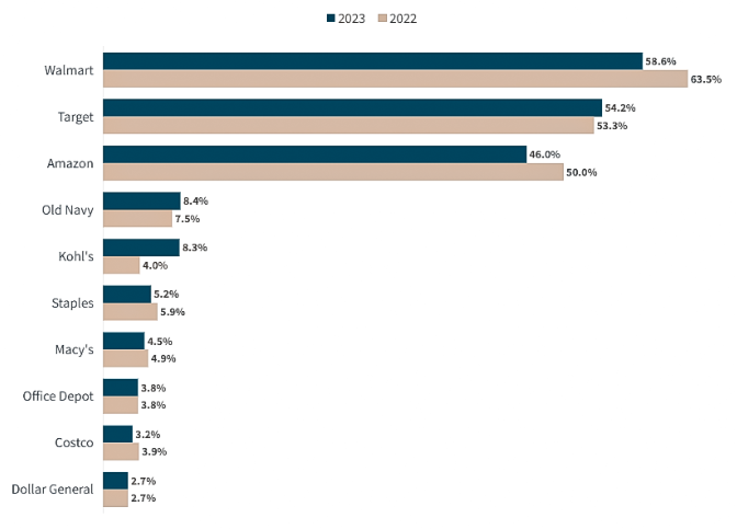 近两年,Walmart、Target和Amazon等零售商是大部分家长们购物的首选,为什么家长偏向到这三家电商平台消费,因为这三家电商平台是可以购买学校用品清单上的所有物品,而且价格“合理”,还能购买服装、电子产品和其他必需品。