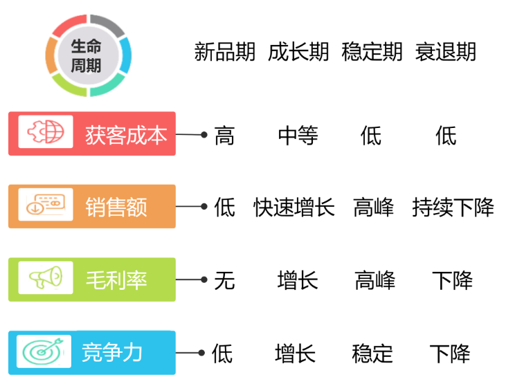 根据以上得出商品生命周期后,定制合理的运营策略计划。新品期认知度低,销量低,需要花费时间引流;成长期认知度上升,销量增大,利润可能有所增加,竞争对手也随之增多;成熟期需要维持品牌忠诚度;衰退期销量和利润下降,收获与清库存。