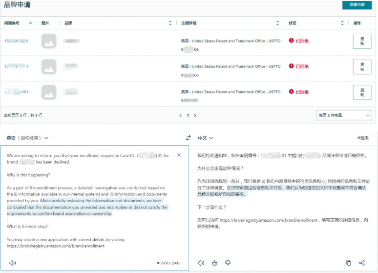 然而新的问题又出现了,注册商标虽然简单,只需1-2周拿到商标注册的回执(TM标)就可以去亚马逊平台备案了,但是现在品牌备案却变得异常艰难。提交完整的资料上去,总是莫名其妙的被拒绝,连拒绝原因都模糊不清,有很多卖家甚至已经提交了十来次,还是被拒绝,且没有明确的原因说明,导致大部分卖家心态崩溃,所以白名单又再一次卷土重来了。