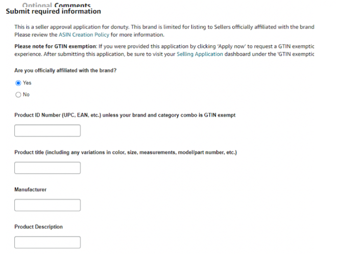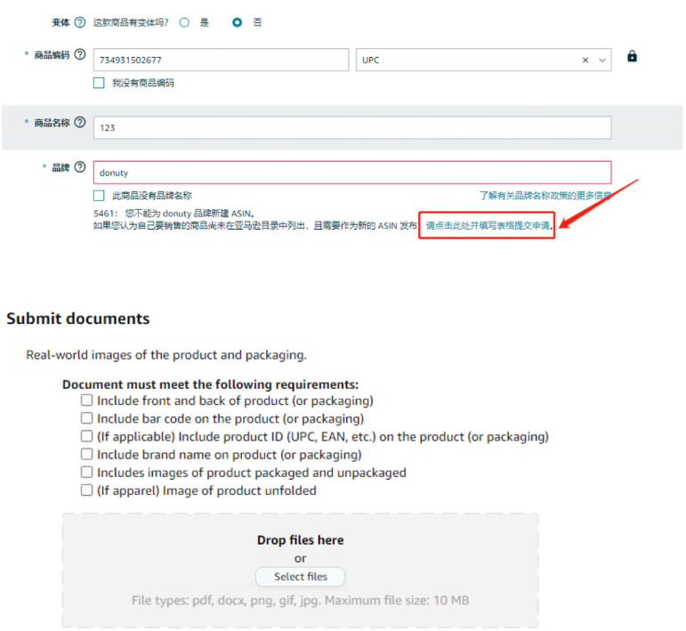 我们可以直接从品牌报错的界面点击链接跳转到白名单的申请界面,在这里填写一些基础的信息并且上传带品牌logo的产品图片或者包装图片。