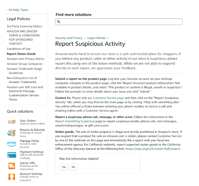 1. 在产品页面提交报告。单击产品详细信息中的“报告不正确的产品信息”链接,然后选择“该产品或内容非法、不安全或可疑”,输入详细信息,然后单击“提交”。