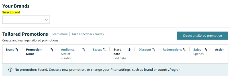 找到品牌定制促销登陆页面后,从左侧的下拉菜单中选择你的品牌,然后单击“创建定制促销”按钮。