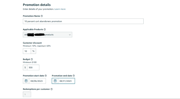 这边举例选择放弃购物车的客户。在下一页上,你需要为促销活动命名,设置折扣百分比、预算以及促销开始和结束日期。