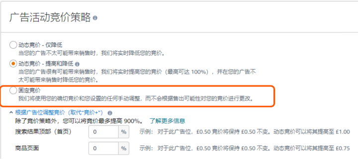 2、低竞价高广告位模式:参考建议竞价的最低值或低于建议竞价在搜索结果顶部(首页)和商品页面加价比如:100%