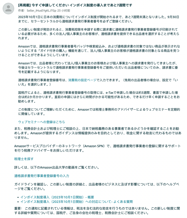 据斑马日本海外仓获悉,亚马逊日本站发布公告称距离日本10月1日生效的消费税发票制度生效还有不到7周的时间,亚马逊建议卖家务必在9月30日之前通过卖家中心注册合格的卖家发票号,以下是公告内容: