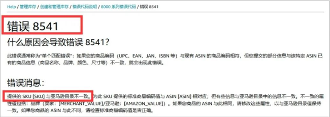 还有一种是8541报错,原因提示是“提供的SKU与亚马逊目录不一致”