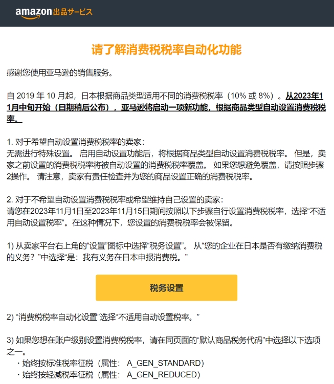 从2023年11月中旬开始(日期稍后公布),亚马逊将启动一项新功能,根据商品类型自动设置消费税税率。