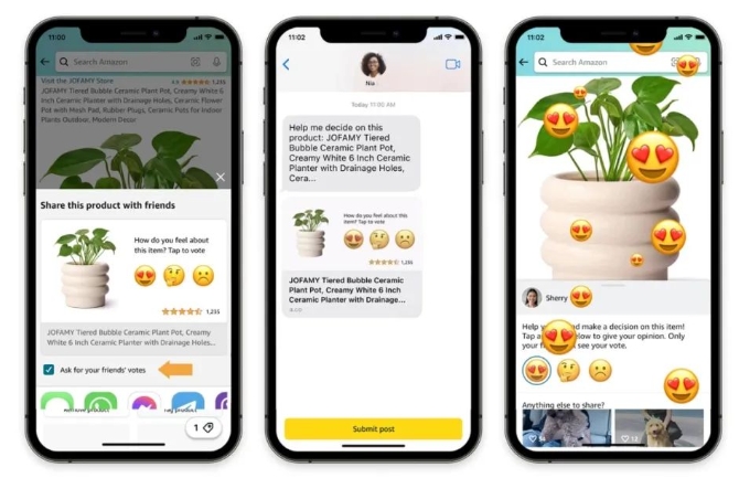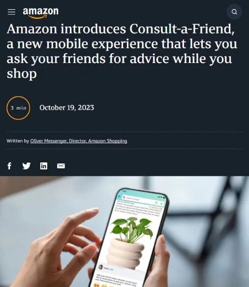 亚马逊表示,顾客在做出购买决定时会考虑各种来源,而朋友和家人的推荐往往是顾客最值得信赖的来源之一。亚马逊内部数据显示,许多顾客会通过应用程序上现有的“分享”按钮与朋友分享产品以获得反馈,今年到目前为止,亚马逊购物应用程序中的“分享”按钮已使用数十亿次,用户通过消息、社交媒体和电子邮件分享产品。