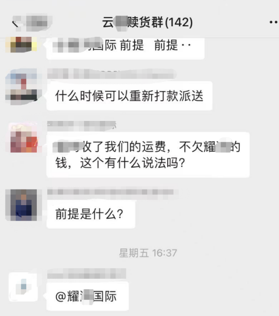2月10日,耀*建立“云*赎货群”,要求卖家按照20元/KG的运费向云创赎货。赎货群里骂声一片,卖家只能自认倒霉。