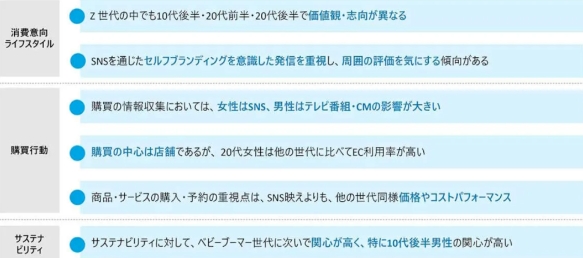 此外,Z世代避免与他人做出相同的选择,强调独特性,有很高的认可欲望,倾向于在评价和自我品牌上投入精力。在Z世代中,这种意识在年轻一代中尤为强烈。当谈到消费者价值观时,人们非常重视口碑和社交媒体信息,他们在购买产品时往往会关注那些畅销且被谈论的产品。还有一种趋势是偏爱考虑可持续性的产品,并被制造过程高度透明的产品和无性别的产品所吸引。在被询问“收集信息和购买时的决策因素”这个问题时,Z世代中的女性主要通过SNS社交媒体收集信息,而男性则通过电视节目和广告收集信息。越年轻的一代,他们使用 SNS 和互联网的次数越多,而年龄越大,他们使用商店展示和插页传单等现实世界媒体的次数就越多。