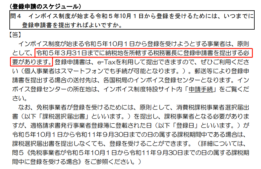 从发票制度开始的2023年(令和5年)10月1日开始注册的经营者,原则上必须在2023年年3月31日之前向管辖纳税地的税务署长提交