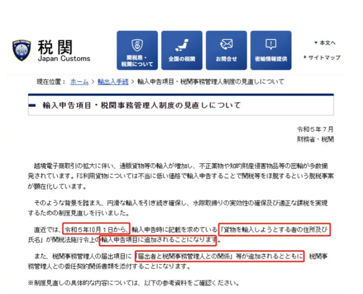 这次海关是强化了ACP制度在清关中的作用:为防止货物进口逃税(包括FBA货物低价进口、冒用日本本土居民直接进口规避关税),进口夹杂非法药物和侵权案发生,10月1日起,进口申报所填的“进口货物者的地址和姓名”将被加入进口申报项目中;在海关事务管理员的备案项目中追加“备案人与海关事务管理员的关系”等,同时要附上与ACP的委托合同。