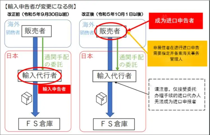 新规前:卖家(非在日居住者)委托的进口代理是进口申报人;新规后:卖家办理进口申报必须委托ACP办理,卖家直接是进口申报主体。